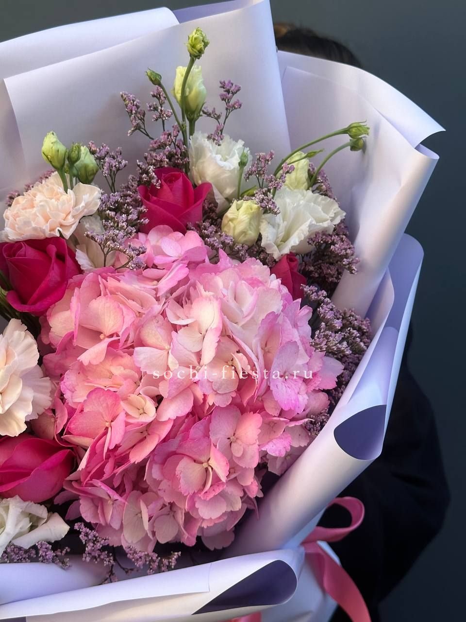 гортензия, гвоздика, статица (или аналог), роза, эустома, дизайнерская пленка, лента.